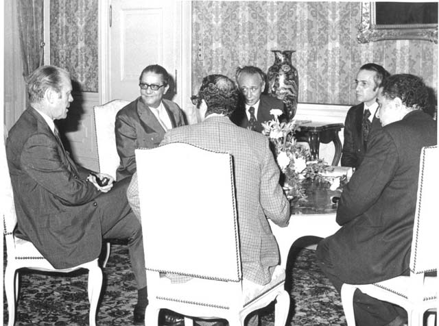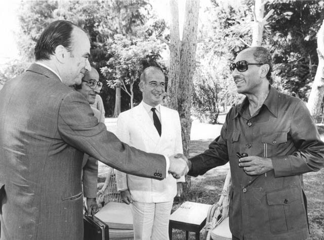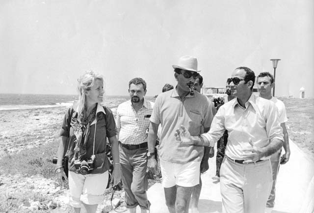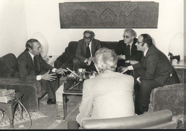 French filming Anwar Sadat With President Anwar Sadat and the French journalists making a film about his life: Jean-François Chauvel, writer and Middle Eastern affairs specialist; reporter, Geneviève Chauvel; and French TV team Egypt (1973)