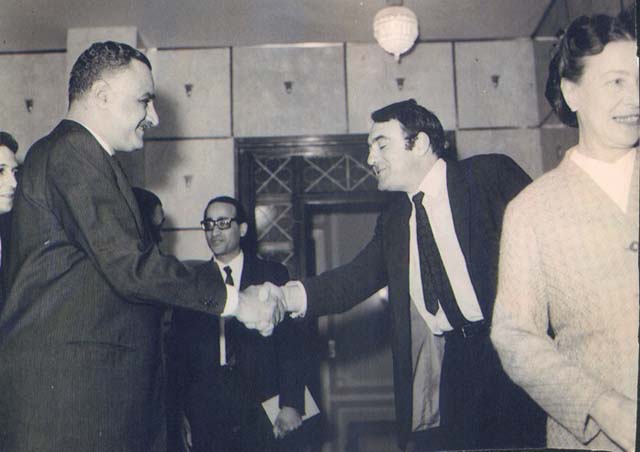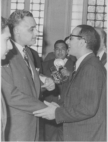 Introducing Lanzmann to Nasser Looking on with Simone de Beauvoir as President Nasser greets French journalist Claude Lanzmann Cairo (2/1967)