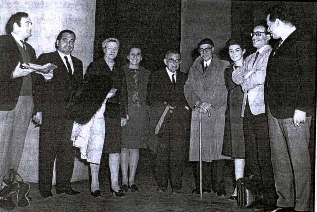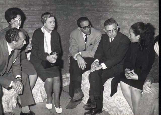 Arrival in Egypt with Sartre, de Beauvoir and Lanzmann Hassanein Heikal, editor in chief of Al Ahram; Tewfik El Hakim, Egyptian writer; and Mr. and Mrs. Loutfi El Kholy greeting philosopher Jean Paul Sartre, writer Simone de Beauvoir, and journalist Claude Lanzmann, upon their arrival to Egypt Cairo (2/1967)